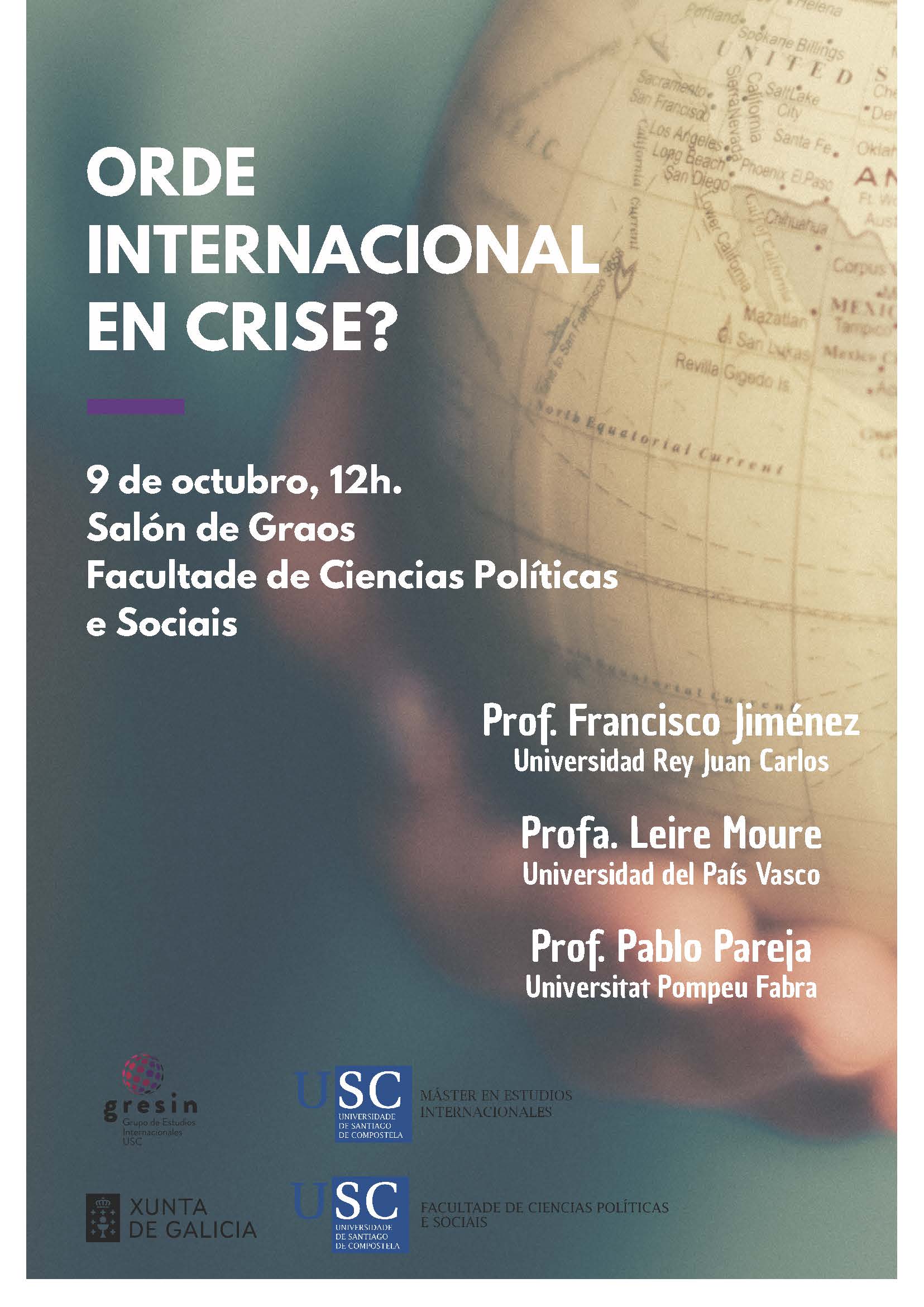 O vindeiro 9 de outubro as 12:00 da mañá no Salón de Graos da Facultade, o Grupo de Estudos Internacionais da USC (GRESIN), o Máster de Estudos Internacionais (USC) e a Facultade de Ciencias Políticas e Sociais co financiamento da Xunta de Galicia invitan a comunidade universitaria a participación no Seminario de Orde Internacional en Crise?