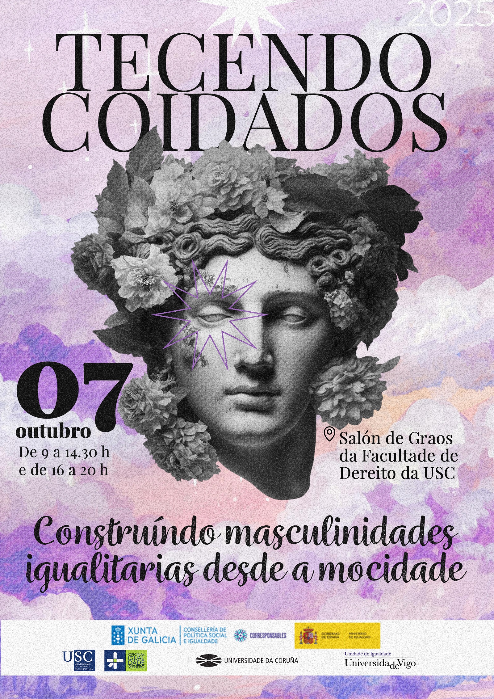 As tres universidades galegas organizan o 7 de outubro unha nova xornada internacional co lema ‘Tecendo Coidados. Construíndo Masculinidades Igualitarias desde a Mocidade’. A actividade pretende pór no centro o valor dos coidados e a construción de masculinidades igualitarias entre a mocidade, evitando seguir reproducindo relacións de poder que impiden avanzar cara a sociedades máis xustas e inclusivas.
