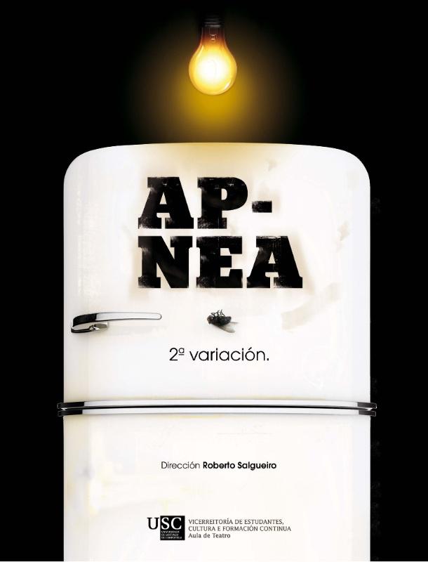 A compañía da Aula de Teatro da USC estreará este martes 17 a súa nova produción ‘Apnea (variación 2ª)’, a partir dun texto orixinal de Roberto Salgueiro. No Salón Teatro de Santiago ás 21.00 horas, a entrada á representación será de balde, previo paso polo despacho de entradas, no que se poderá retirar ata un máximo de dúas entradas por persoa. A nova estrea da compañía teatral universitaria porá en escena unha visión crítica da Galicia actual a partir dun texto orixinal do propio director da compañía, Roberto Salgueiro. Compoñen o elenco de actores e actrices Marcos Montiel, Alba López, Carlos Hermida, Aldara Cidrás e Miguel Gendre.