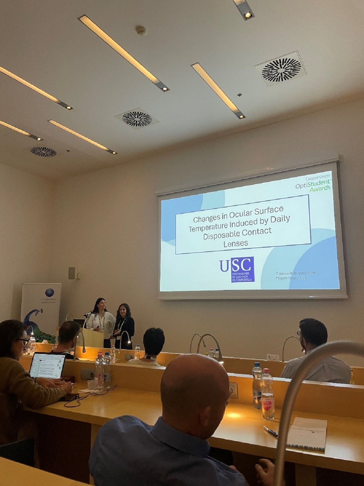 A competición tivo lugar en Budapest, a onde acudiron acompañadas do seu titor académico, Jacobo García Queiruga, e nela as dúas estudantes da USC destacaron pola calidade e claridade de exposición do seu traballo, que defenderon en inglés diante dun tribunal experto, e que tratou sobre os cambios na temperatura ocular inducidos por lentes de contacto diarias.