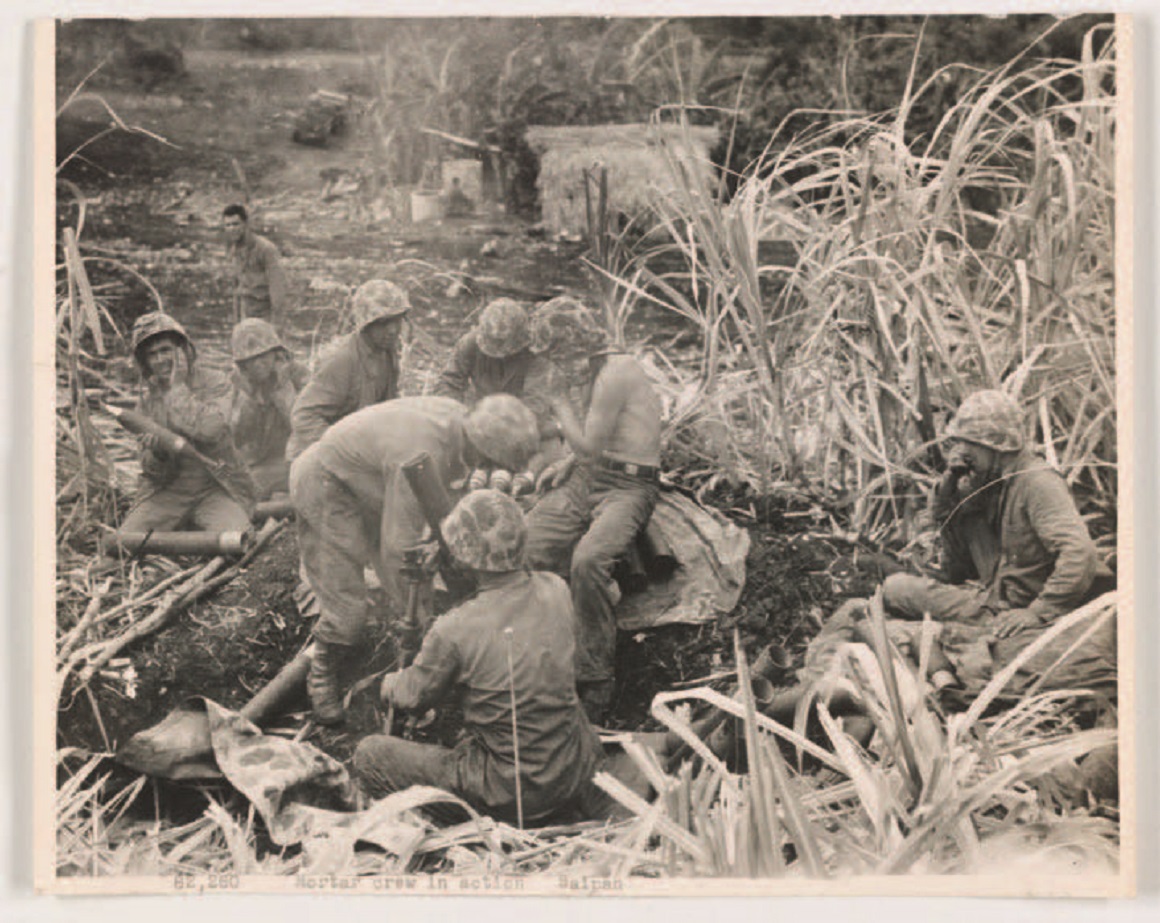 Marines cun morteiro de 81 mm en acción en Saipan. Imaxe extraída do artigo ‘«Uncommon valor»: Abel Faraldo, un emigrante gallego en el cuerpo de marines de los Estados Unidos durante la Segunda Guerra Mundial’