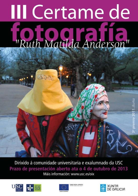 Alumnado e antigos alumnos/as da USC, así como persoal de administración e servizos e docente e investigador da Universidade compostelá, son os destinatarios do III Certame de Fotografía Ruth Matilda Anderson, acción coa que a USC tenta promover a igualdade dentro e fóra da comunidade universitaria. O prazo de presentación de orixinais permanecerá aberto ata o 4 de outubro. As imaxes, que se entregarán en formato dixital cunha resolución mínima de 300 ppp e un tamaño A3 ou A4, presentarán como temática cuestións que teñan unha relación directa coa muller dende diversas perspectivas (visibilización do traballo, mulleres e ciencia, ruptura de estereotipos de xénero,...). Premiarase a creatividade, innovación e impacto da imaxe. O Xurado seleccionará as vinte e cinco fotografías de maior calidade técnica e artística sempre que se axusten á temática establecida na convocatoria. Con elas realizarase unha exposición itinerante por diversos centros da USC. De entre estas, o xurado seleccionará as tres mellores que se repartirán un primeiro premio de 1.000 euros de dotación económica (a imaxe utilizarase ademais como cartel conmemorativo do Día Internacional das Mulleres en 2014), un segundo de 800 euros e un terceiro dotado con 500 euros. O certame toma prestado o nome dunha muller que fixo un traballo importante nun campo tradicionalmente desenvolvido por homes, cunha destacable obra na que se inclúe a súa visión persoal da muller galega dos anos 20. Para acadar máis información, as persoas interesadas poden dirixirse á web da Oficina de Igualdade de Xénero da Vicerreitoría de Responsabilidade Social e Calidade.