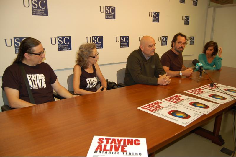 Matarile Teatro retomará a súa actividade coa estrea da obra Staying alive, espectáculo que están a preparar na USC en calidade de Compañía Residente, unha iniciativa pioneira no teatro universitario español que a Universidade de Santiago desenvolve este curso dentro do programa de formación da Aula de Teatro universitaria. A estrea, este venres 27 ás 21.00 horas na Sala Roberto Vidal Bolaño (Auditorio Universitario, Campus Vida), presentárona aos medios de comunicación o director da Área de Cultura da USC, Pablo Sampedro; o director da Aula de Teatro da USC, Roberto Salgueiro; e unha representación da compañía Matarile, integrada por Ana Vallés, Baltasar Patiño, Mónica García, Rut Balbís, Nuria Sotelo e Daniel Baamonde. Ademais das particularidades do espectáculo e do apoio da USC na volta á escena de Matarile, nesta rolda de prensa prestouse atención ao interese pedagóxico que supón para os universitarios/as a posibilidade de participar nun proxecto de colaboración no que está implicado unha compañía profesional. Para os integrantes da Aula de Teatro da USC e os/as participantes dos seus cursos de formación é unha oportunidade, explica Roberto Salgueiro, para coñecer de preto as dinámicas de traballo dunha compañía profesional e as particularidades do seu traballo tanto no deseño previo como no desenvolvemento posterior á estrea. Entre o teatro universitario e a escena profesional existe unha relación estreita, de retroalimentación continua segundo explica Salgueiro. Con esta iniciativa, a Aula de Teatro da USC quere potenciar a comunicación do teatro universitario coa súa extensión máis inmediata no contorno profesional. Este último, explica o director da Aula de Teatro universitario, atopa nos campus unha importante canteira de recursos humanos, tanto no artístico como en todas as cuestións técnicas vinculadas á escena en Galicia. Esta relación explica que unha elevada porcentaxe das novas compañías profesionais ou semiprofesionais teñan a súa orixe en universitarios/as. Programa de formación O programa de formación da Área de Teatro da USC iniciou este curso unha nova etapa tras mudar por completo o seu deseño e introducir un novo elemento como é a Compañía Residente, que servirá para convidar un grupo de teatro profesional e compartir deste xeito experiencias co estudantado que se achegue á Aula de Teatro universitaria. Ademais da compañía residente, as distintas iniciativas formativas agrúpanse en dous bloques dedicados a completar as habilidades e destrezas das persoas que se apunten no ámbito da Dirección e no da Interpretación, en ambos os dous casos co recoñecemento de cinco créditos ECTS. O primeiro bloque temático desenvolverase á súa vez en tres módulos nos que se prestará atención a ‘ Dramaturxia e dirección’ cun carga lectiva de 50 horas, Prácticas de Dirección (50 horas) e un terceiro a modo de monográfico de creación teatral (de 8 horas) e outro de iluminación (de 28 horas) no que se integra a Compañía residente. Estes tres módulos estenderanse entre setembro e decembro, ao longo de marzo e entre febreiro e marzo, respectivamente. Nos mesmos meses, celebraranse tamén os tres módulos agrupados no bloque dedicado a Interpretación. No primeiro módulo ofertarase formación específica en Interpretación (20 horas), control do corpo (18 horas) e da voz (12 horas) e iluminación (4 horas). No segundo increméntase o traballo arredor da interpretación (42 horas) e sobre o corpo e a voz (6 horas máis para cada tema), para rematar cun monográfico de interpretación (28 horas) que se desenvolverá no marco da Compañía en residencia.