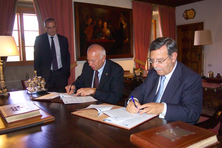 O reitor Juan Casares e o presidente de Red Eléctrica de España, José Folgado Blanco, asinaron este mércores 17 en San Xerome un acordo marco para o desenvolvemento de actividades de interese común que potencien a colaboración entre a Universidade e a empresa no ámbito da investigación, o desenvolvemento tecnolóxico, a formación universitaria, a inserción laboral e outros ámbitos de interese social. Inicialmente, o acordo terá unha duración dun ano que se poderá renovar por sucesivos períodos anuais. Na mesma sesión se formalizou o primeiro dos acordos específicos que se vai desenvolver ao abeiro deste convenio marco e polo que Red Eléctrica de España participará no desenvolvemento do Máster de Enerxías Renovables e Sustentabilidade Enerxética durante o curso lectivo 2013-2014, como xa vén sucedendo dende o ano 2011. Deste xeito, a compañía impartirá doce horas lectivas divididas en dúas sesións de seis horas cada unha das que se encargarán persoal altamente cualificado. Os contidos que abarcarán serán o sistema eléctrico nacional, a rede eléctrica de transporte e a integración de renovables no sistema eléctrico. Esta cooperación inclúe tamén a realización dunha sesión práctica consistente nunha visita a unha instalación da rede de transporte como complemento das sesión teóricas e durante a que se describirán e identificarán sobre o terreo os diferentes elementos que forman unha subestación, as súas características e funcións.