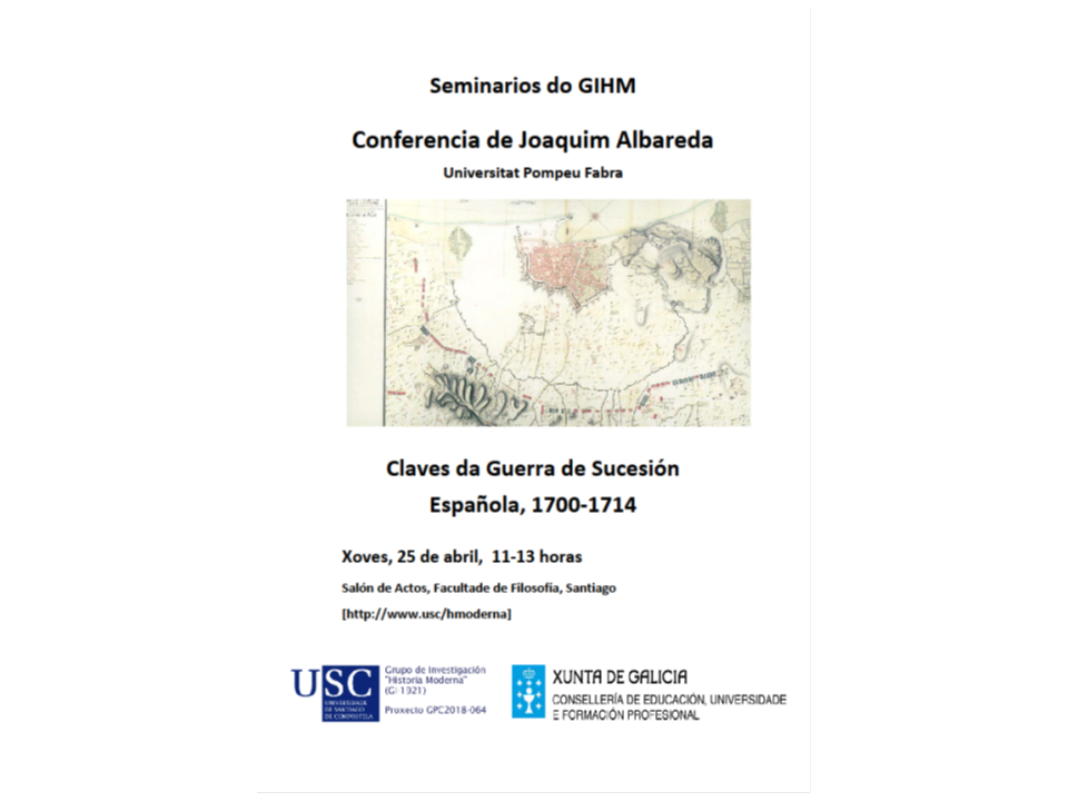 No marco do programa de Seminarios do GIHM, o vindeiro xoves 25 ás 11 da mañá terá lugar no Salón de Actos da Facultade de Filosofía da USC, sita na praza de Mazarelos, a palestra con Joaquim Albareda Salvadó, quen informará ós asistentes sobre as principais chaves que permiten comprender o desenvolvemento da Guerra de Sucesión española (1700-1714), así como a posición que nela tiveron os territorios, as elites e os pobos das Coroas de Castela e Aragón.